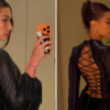 In a range of shots, Bieber exhibits the all-black look she had on, characterizing the outfit as one of the most flirtatious of the season. The sleeveless leather top of the outfit had a lace-up detail running along the back and fringe were the extensions of the arms. The photographer has not captured the front of the top, but the high neckline with a slim slit could be seen. The model completed the top with black velvet flared trousers, which gave a seasonal vibe to the outfit.